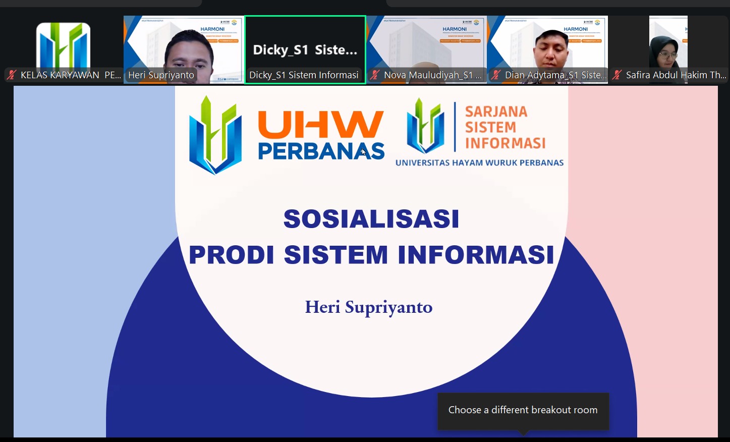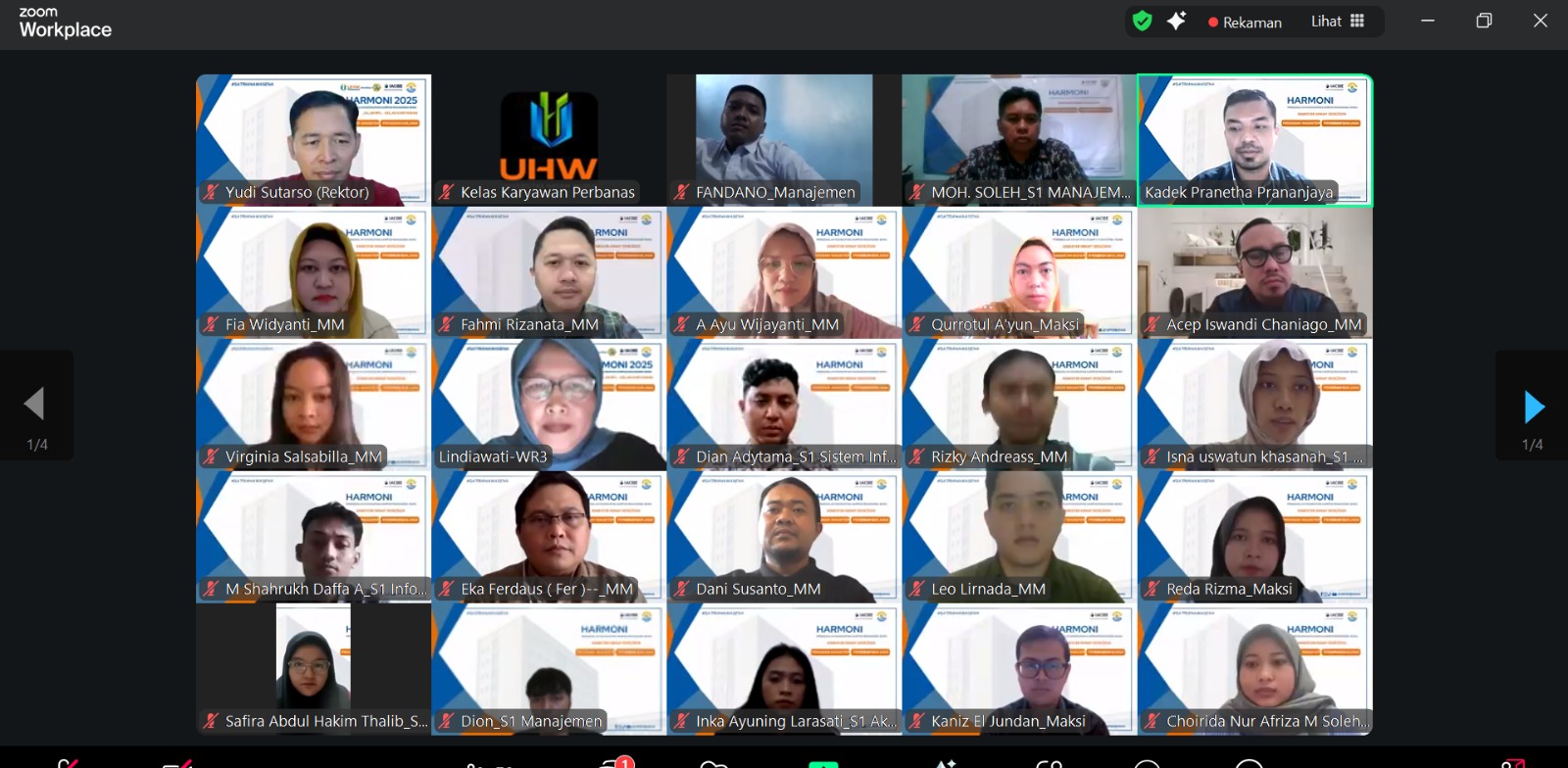 Acara di mulai Jam 08.00 sd selesai melalui aplikasi Zoom Meeting dengan acara Sambutan dan Pengarahan dari Rektor Universitas Hayam Wuruk Perbanas, Dr. Yudi Sutarso, S.E., M.Si yang dilanjutkan dengan Pelantikan Mahasiswa Baru.